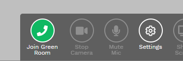 After you have verified that your camera and microphone are operating properly in the Studio, you must enter the Green Room. To do so, click or tap the green button located at the left end of the Control Panel. The button, labeled Join Green Room, is shown in the illustration below.